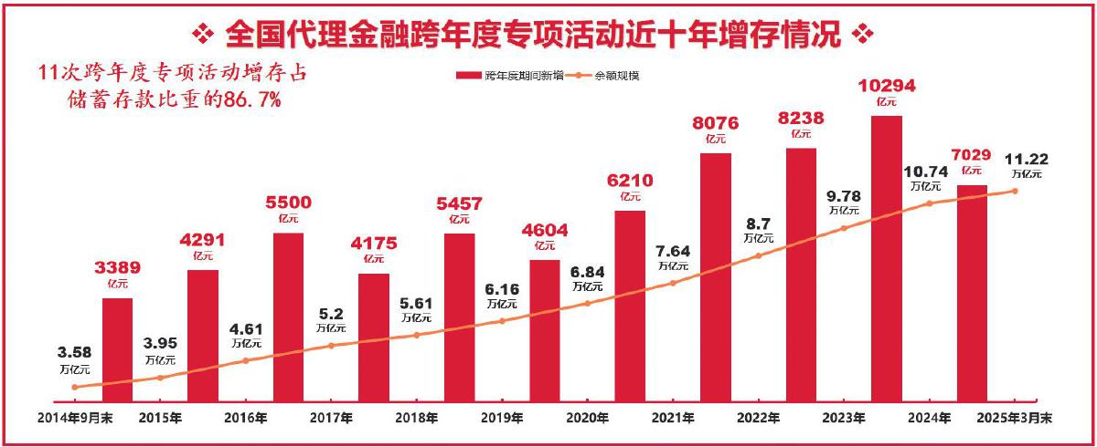 2015年6月,集团公司发文设立储汇业务处等代理金融管理处室,随后在全国邮政金融开展“邮银一家 共拓蓝海”专项营销活动,对邮银先进单位、先进个人进行表彰。2016年,为进一步调动各级机构加快代理金融发展的积极性,确保储蓄存款规模稳定增长,集团公司、集团工会创新推出全国代理金融争创“十强百优千佳”(十强省份、百优地市、千佳网点)劳动竞赛,激励直达网点一线,当年初见成效;为抢抓岁末年初旺季发展机遇,进一步发挥邮政大网资源优势,有效整合社会资源,全力推进代理金融“融合发展 科学发展”,力争实现资金流量最大化,提质增效,有效引导代理金融持续、健康、科学发展,在2017—2018跨年度期间再次开展全国邮政代理金融“十强百优千佳”营销活动,并延续至今,逐步加大完善重点业务发展支撑力度。同时,通过连年组织多部门多专业参加全国邮政代理金融“融合发展 科学发展”培训班,在《中国邮政报》开辟专栏,编发通报、案例,召开专题会、现场会、远程会,搭建交流分享平台,层层传导“集聚资源 协同合作 全国联动 聚合客群”营销方式。邮银协同、专业融合、合作多赢,不断丰富代理金融产品、服务、功能、品牌,跳出存款抓存款。“报刊+金融”融合推出营业网点“素质教育主题邮局”服务品牌。经教育部批准,开展全国中小学生创新作文大赛,在江西赣州、重庆万州等地赛区获客获金成效显著。2020年,在全国部署深入开展“一城一局一校”素质教育主题营销活动,培育壮大全国性幼儿少年学生及其家长、学校价值客群。邮银协同项目获集团公司、全国通信行业创新管理年度奖项。集团公司推出邮乐网“邮惠购”全国客户积分兑换活动,有效活客黏客。 2014年末至2025年首季,代理金融储蓄存款累增7.55万亿元,规模突破11万亿元,业务收入年均增幅超15%,以“十强百优千佳”劳动竞赛为抓手的11次跨年度专项活动成为近年来代理金融客户规模、储蓄存款、业务收入持续较快增长的“主引擎”。