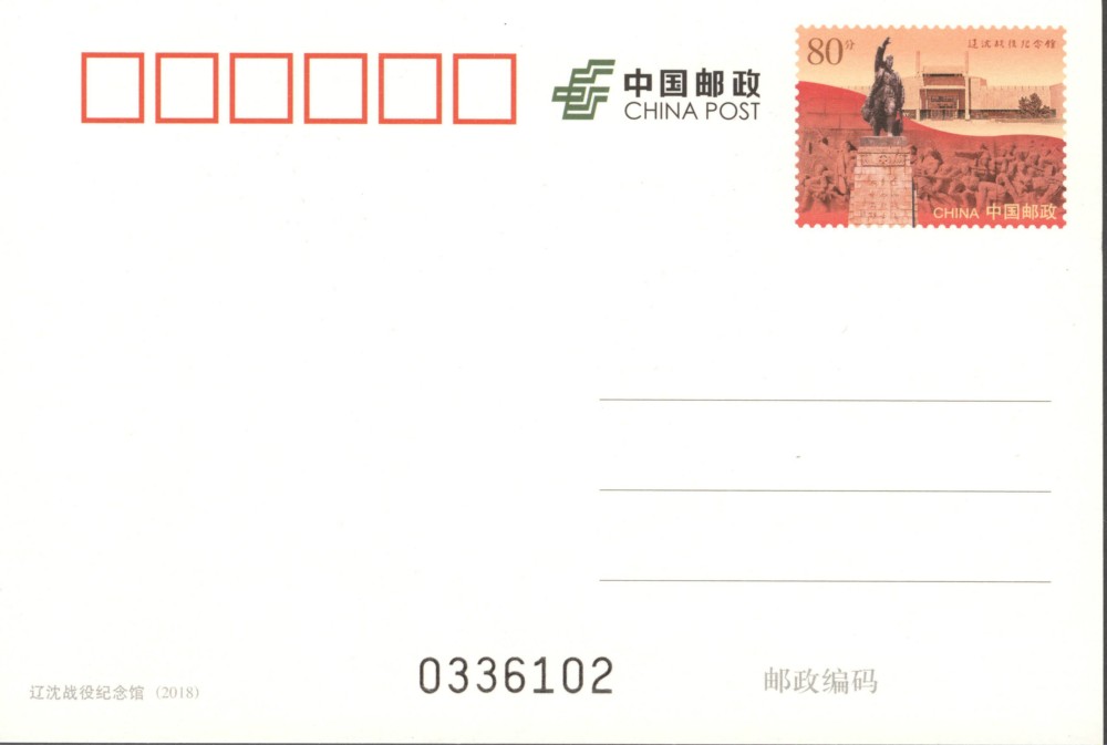 中国邮政定于2018年11月28日发行《辽沈战役纪念馆》普通邮资明信片1枚,明信片规格148×100毫米,明信片邮票面值80分,售价1元。
