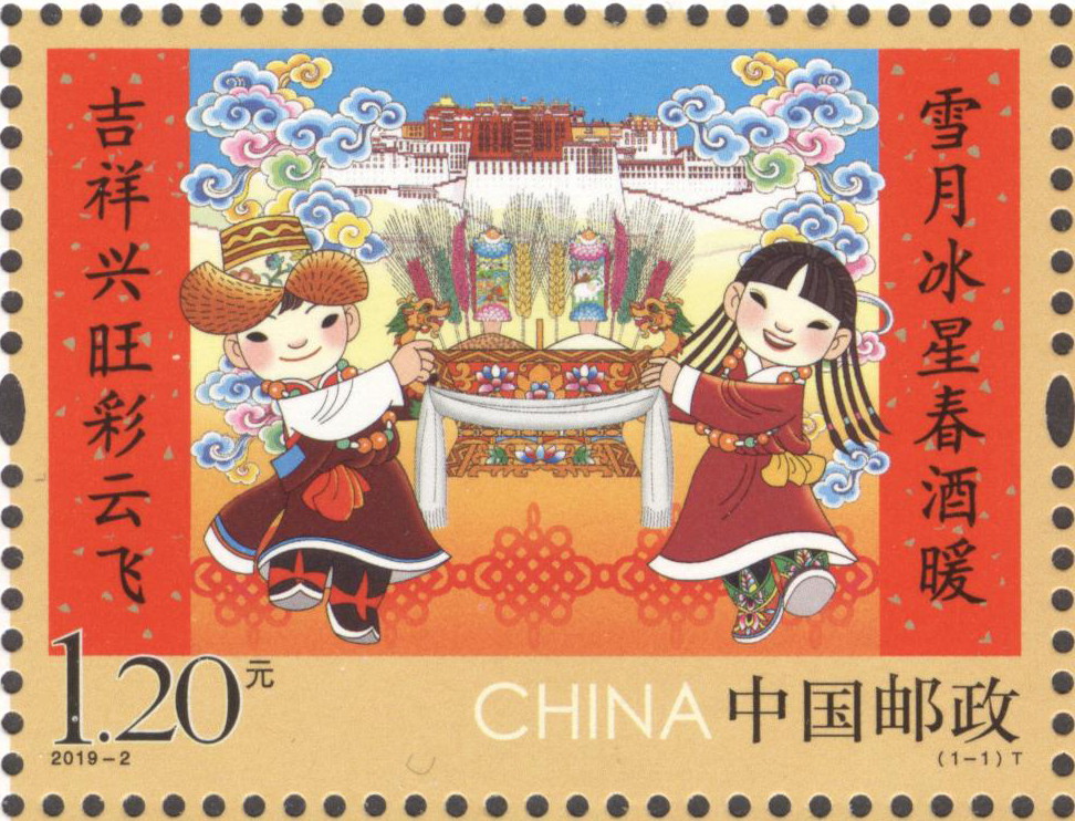 该套邮票是《拜年》系列的第五套。邮票主图为“欢欢”、“喜喜”,背景衬以位于西藏拉萨的布达拉宫。“欢欢”和“喜喜”身着藏族传统服饰,手捧象征吉祥的切玛,在藏民族聚居区向全国各族人民拜年。画面两侧楹联文字为“雪月冰星春酒暖 吉祥兴旺彩云飞”。整个画面轻松愉悦,洋溢着新年的喜庆气氛。