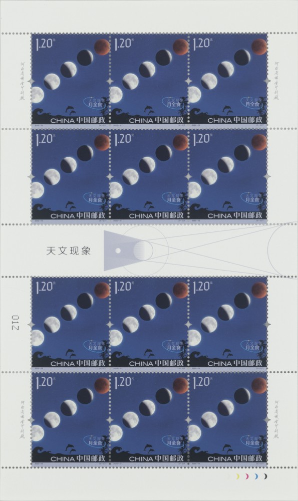 月食的原理和日食类似。在农历十五、十六,月亮运行到和太阳相对的方向。这时如果地球和月亮的中心大致在同一条直线上,月亮就会进入地球的本影,而产生月全食。邮票第二枚“月全食”以五个由缺至圆的月亮再现月食发生的过程。