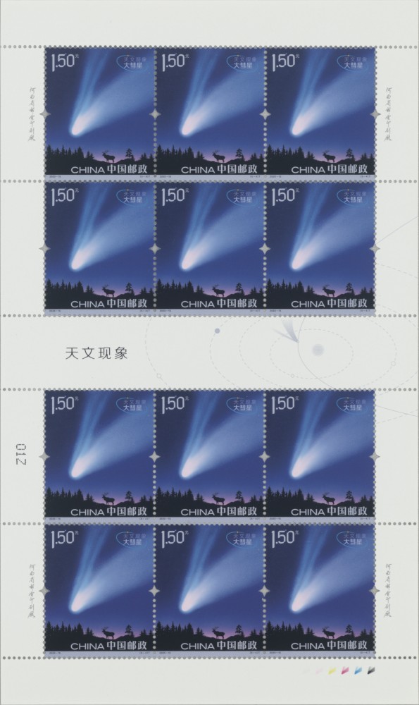 该套邮票由原艺珊设计,河南省邮电印刷厂印制。通过印制工艺展现不同 “天文”概念。日环食邮票首次巧妙运用高亮点工艺材料营造出日环食边缘明亮、生辉的效果。月全食邮票中,夜光墨的使用来表现满月到月全食过程中不同亮度的月光效果。流星雨邮票的立体幻彩材料突显出时而一泻千里、时而一闪即逝流星雨的效果。大彗星邮票的特殊材料表现出大彗星的丰富层次,犹如夜晚的星空中闪耀着迷人的光芒。水星凌日邮票深蓝色背景独创性景深透明材料,烘托票面立体层次视觉效果。在紫外灯照射下,能清晰的看到整套邮票黑色剪影的线条荧光效果。