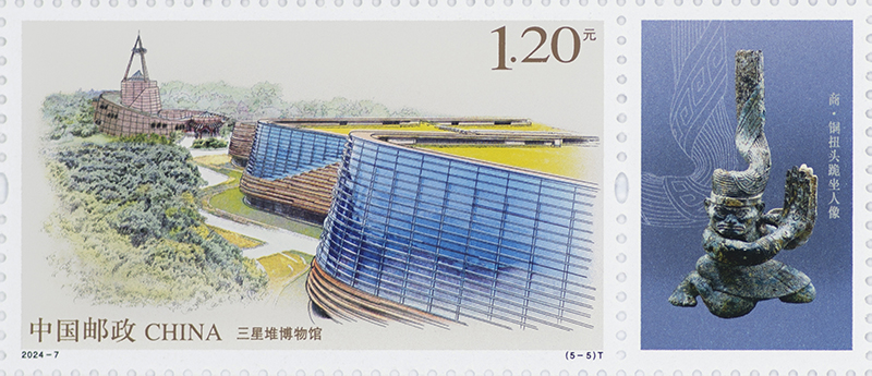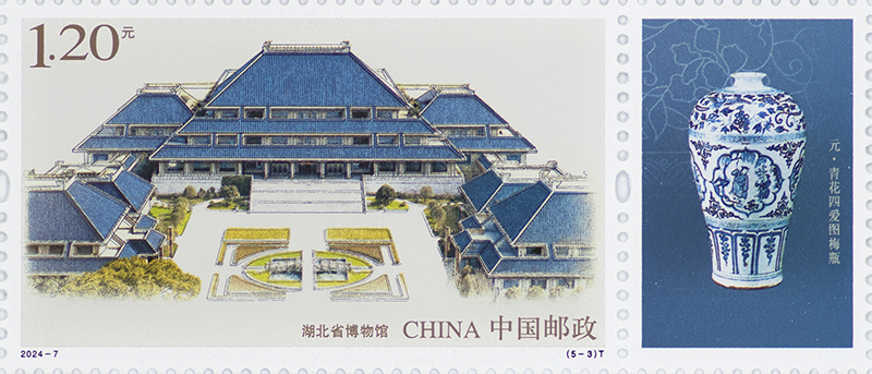 该套邮票采用主附票设计形式。主票体现了5座博物馆建筑特色,简洁雅致的色彩、清晰有力的线条,彰显出稳定而极富张力的建筑美感;附票为各馆推荐的重要文物,展现出我国灿烂的传统文化和悠久的历史传承。第一枚中国考古博物馆是由中国历史研究院建立的国内第一家以考古命名的国家级专业博物馆。该馆以“历史中国,鼎铸文明”为主题,以“仓储式陈列,沉浸式体验”为特色,集展览展示、收藏保护、学术研究、宣传教育为一体。附票表现商代嵌绿松石象牙杯,为商晚期牙雕,1976年在河南省安阳市殷墟妇好墓出土,被列入《首批禁止出国(境) 展览文物目录》。第二枚辽宁省博物馆是一座现代化的大型综合历史与艺术类博物馆,其前身为1949年创建的东北博物馆,是新中国建立的第一座博物馆,1959年改称辽宁省博物馆。附票表现新石器时代玉玦形龙,为目前已知红山文化玦形玉猪龙中形体较大、形制最规整的一件。第三枚湖北省博物馆是国家一级博物馆,馆藏文物体系完整、数量丰富、质量精湛、地域特色鲜明,在国内外享有盛誉。附票表现元代青花四爱图梅瓶,梅瓶腹部分别绘王羲之爱兰图,陶渊明爱菊图,周敦颐爱莲图,林和靖爱梅、鹤图。第四枚湖南博物院是湖南省最大的历史艺术类博物馆,是首批国家一级博物馆,馆藏文物中尤以马王堆汉墓出土文物、商周青铜器、楚文物、历代陶瓷、书画和近现代文物等最具特色。附票表现商代皿方罍,该皿方罍器型硕大,雄浑庄重,雕刻精美,富丽堂皇,是中国晚商青铜器鼎盛时期的代表之作,充分反映了中国青铜器铸造的高超技艺和摄人心魄的气势。第五枚三星堆博物馆,其新馆对标世界一流博物馆建设,是目前西南地区最大的遗址类博物馆单体建筑。馆内文物生动揭示出古蜀文明的灿烂辉煌,彰显着中华文化永久魅力和时代风采。附票表现商代铜扭头跪坐人像,从造型、纹饰等方面来说都是三星堆考古全新的发现,对研究三星堆的青铜铸造技术及艺术、宗教信仰与社会体系、与周边地区的文化交流具有重要意义。